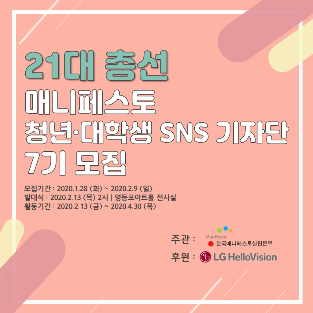 💥안녕하세요. 여러분! 21대 총선을 맞이하여 한국매니페스토실천본부가 주관하고 LG헬로비전이 후원하는 21대 총선 매니페스토 청년·대학생 SNS 기자단을 모집합니다. 💥