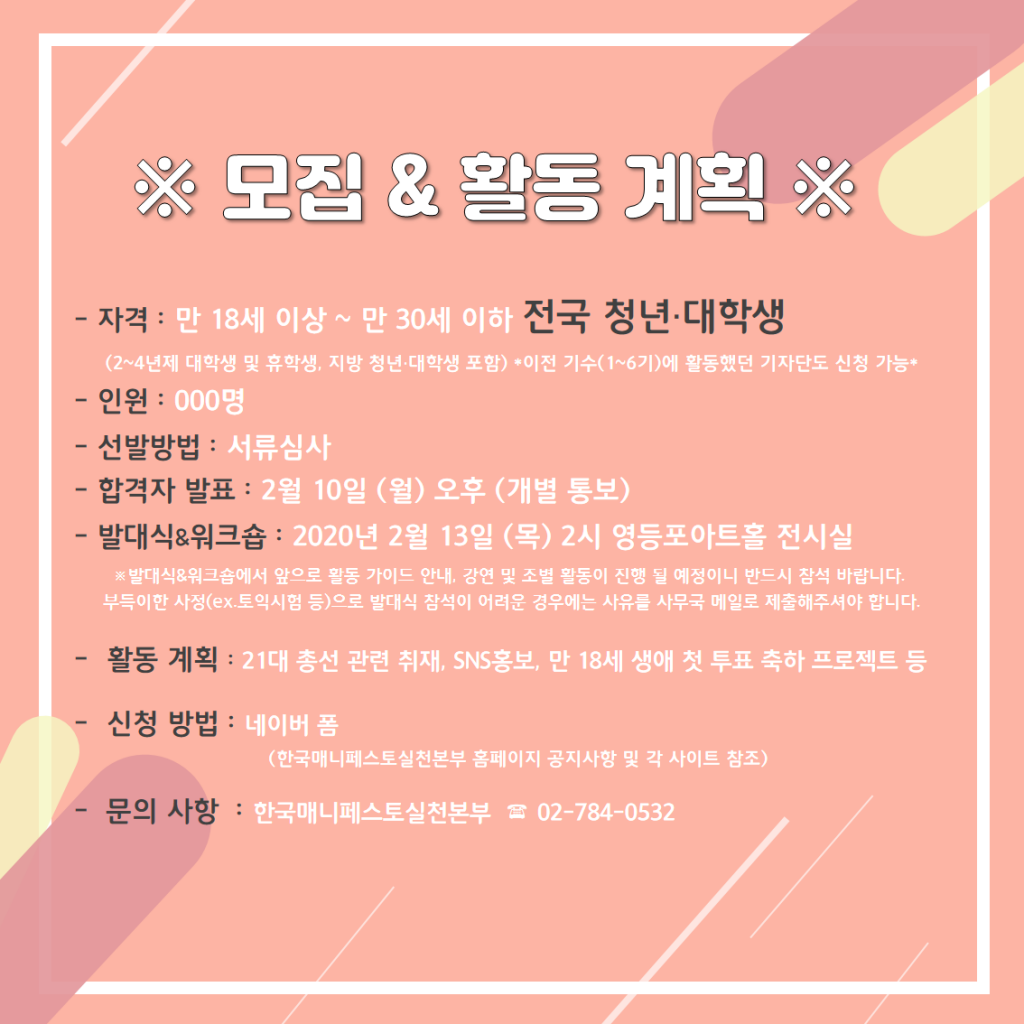 • 한국형 매니페스토 운동에 청년 지성인 대학생들의 참여와 올바른 확산을 위하여, 사)한국매니페스토실천본부에서는‘7기 매니페스토 청년· 대학생 SNS 기자단’을 모집합니다. 매니페스토운동은 ‘선거공약을 깨뜨려도 괜찮은 약속이 아니며, 더 이상 표를 얻기 한 거짓말하지 말라’는 경고입니다. 이와 함께 헌법에 명시된 대한민주공화국의 국체규정으로부터 출발하는 성숙한 민주시민운동입니다. ‘새로운 정치는 내가 만든다’는 진취적인 사고를 갖고 있는 대학생 여러분들의 극적인 참여를 기다립니다. 이번 7기 기자단에서는 다가올 4.15 총선을 맞이한 프로그램이 준비 되어 있으니 많은 참여 바랍니다.