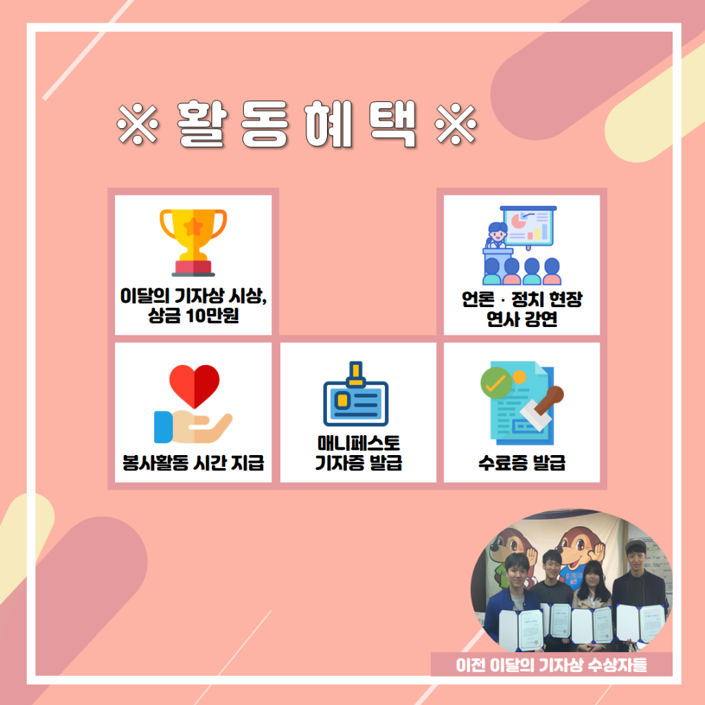 • 매월 이달의 기자 시상 (상금 10만원)