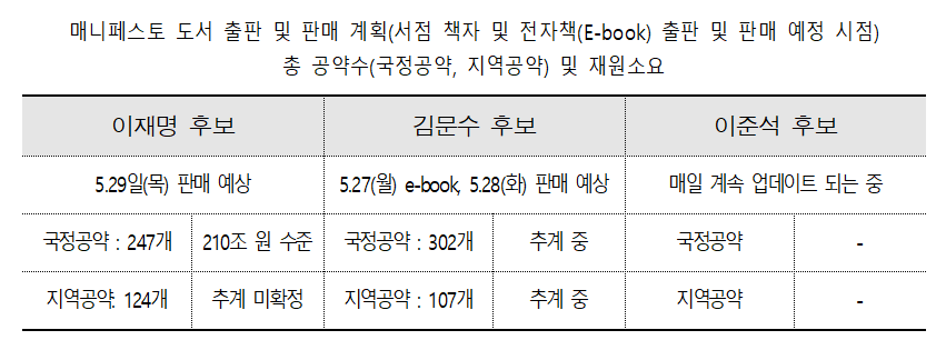 이재명 후보는 지역공약이 124개, 김문수 후보는 107개 등이 있다고 밝혔지만 재정 추계는 미확정 혹은 추계 중이라는 모호한 표현으로 제시했습니다. 이에 반해 이준석 후보는 국정공약·지역공약 총수 및 재정 추계를 밝히지 않았습니다.