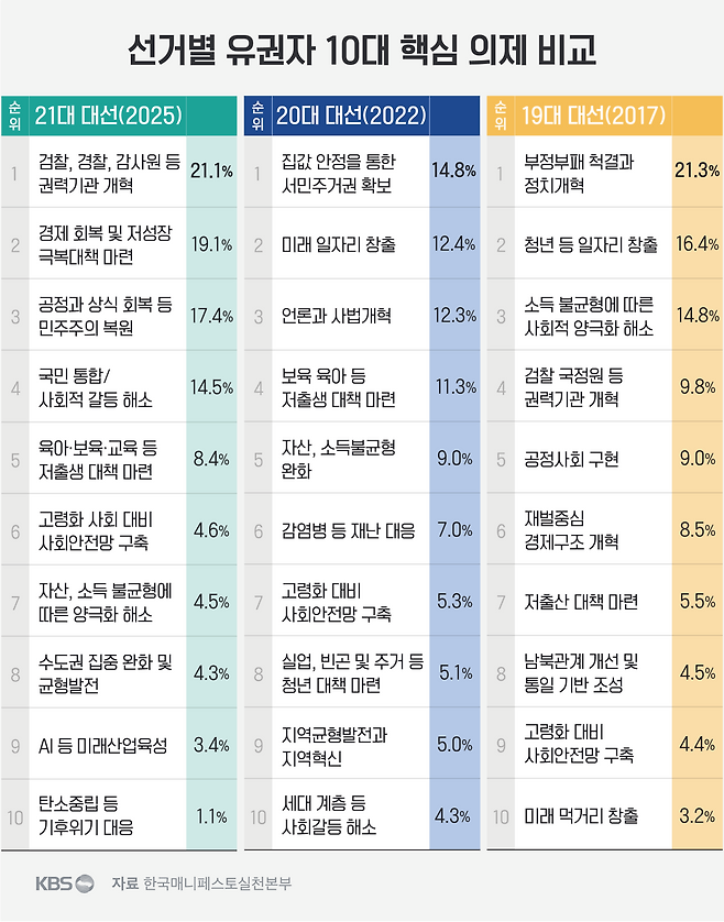 2017년 19대 대선 당시 유권자들이 꼽은 1순위 의제는 ‘부정부패 척결과 정치개혁'(21.3%)이었습니다. 2022년 20대 대선에선 ‘집값 안정을 통한 서민 주거권 확보'(14.8%)가 1순위를 차지했습니다.