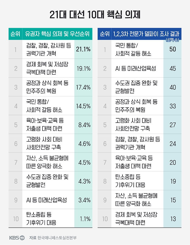 ■ 유권자 1순위 ‘권력기관 개혁’…전문가 1순위 ‘국민 통합’